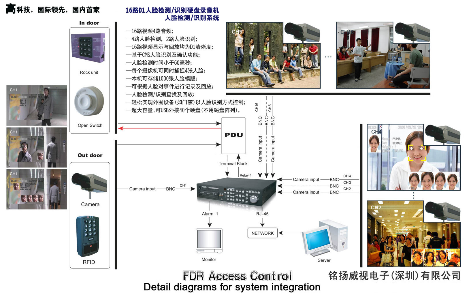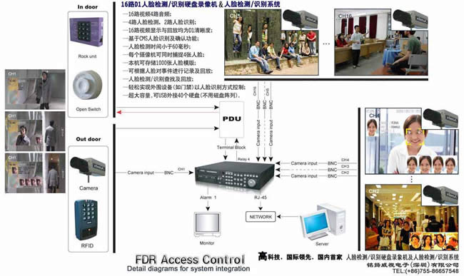 —— 不用钥匙不用卡 人脸检测识别门禁:当有人从安装在门前处的摄像机前通过时,DVR将经过摄像机前的人的人脸(头像)自动抓拍下来并贴加到录像画面上,同时将头像自动传到DVR比对,确认他的身份是否有效的(主机内先行存储有他的头像照片和身份信息),如是身份是有效的,主机给出继电器开关信号驱动门禁自动开锁打开房门(这就是人脸自动检测及识别+人脸自动控制系统的门禁)。
